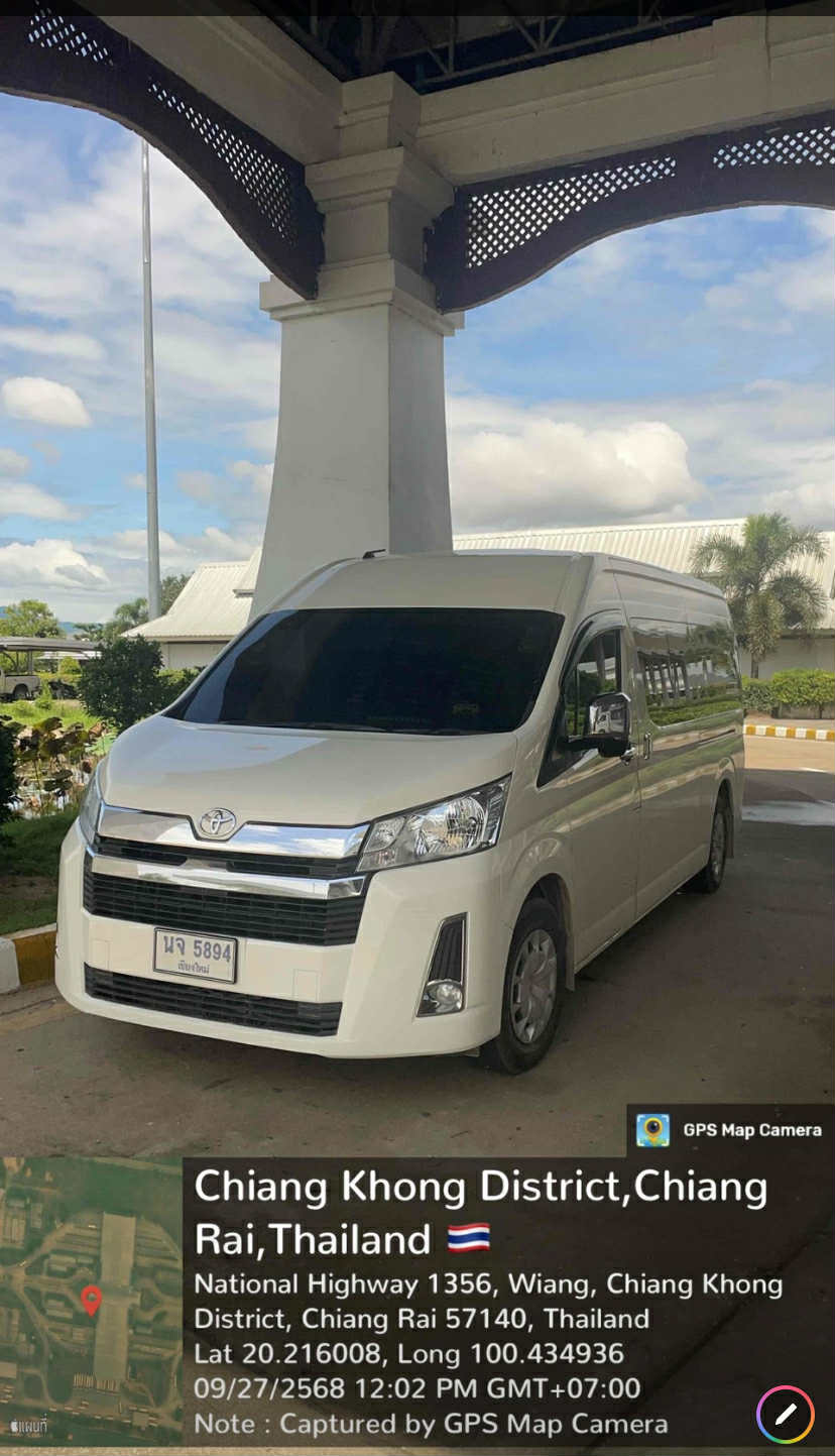 Travel by van to the Chiang Khong Border Checkpoint, Chiang Rai Province, arriving at around 12:30 PM.